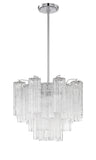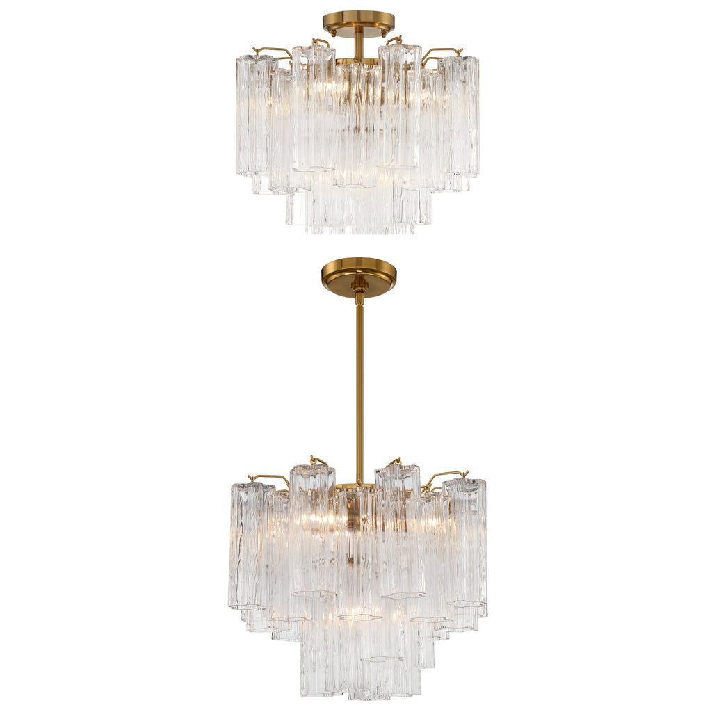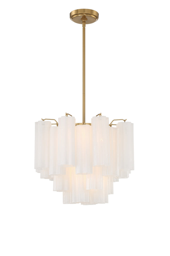 - The captivating Addis Lighting is a modern-day interpretation of the iconic mid-century Tronchi chandelier. Inspired by its predecessor's sleek lines and geometric shapes, the Addis features a Polished Chrome or Aged Brass metal frame that exudes sophistication and style. Its unique design showcases transparent tiers of textured Tronchi glass tubes, forming a mesmerizing 5-point rounded star shape. Choose from a range of glass colors, including clear, amber, smoke, and white, or the stunning Autumn and Spring options, which feature a captivating multicolor disposition. The Addis Collection offers various sizes and finishes, allowing you to find the perfect fit for your space while adding a touch of timeless elegance.
