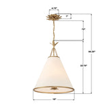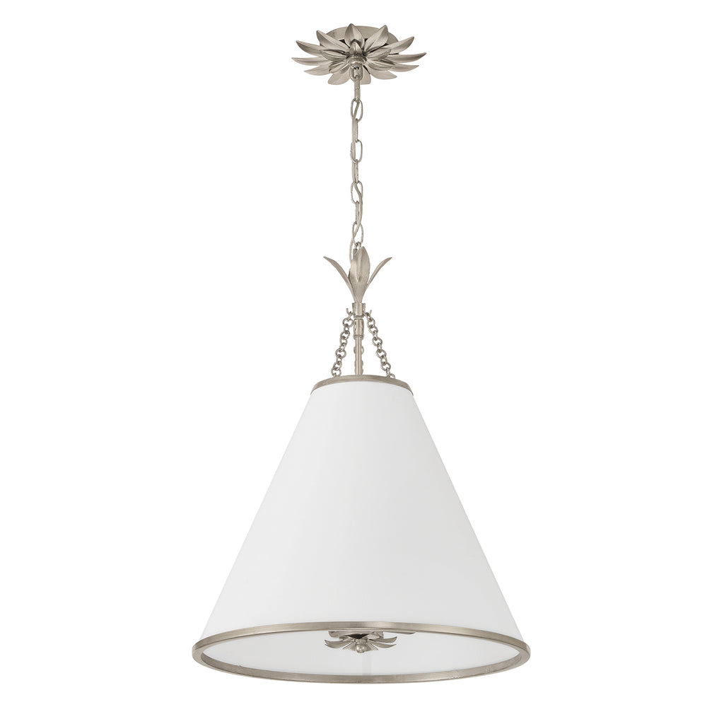 - White fabric cone shade dressed with delicate metal leaf accents.