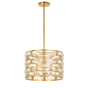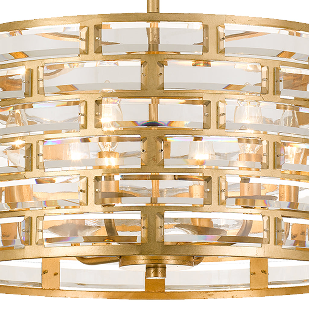 - Rich hand cut crystal meets clean golden lines resulting in vibrant style for any home. Candelabra lights shine through the open drum design of the Meridian. The rhythmic frame features rich curved hand cut crystal jewels arranged on a contemporary frame. This statement piece is perfect to add grandeur to a dining room, hallway or bedroom.