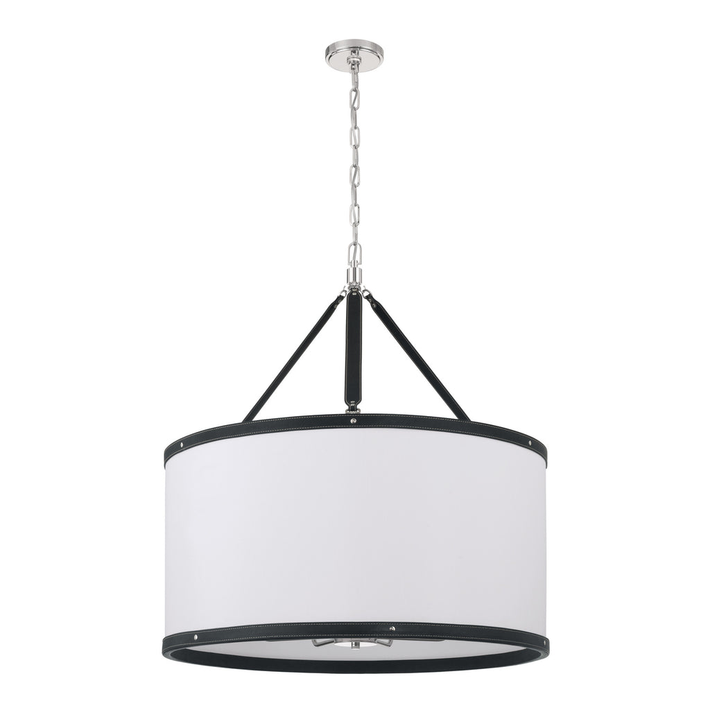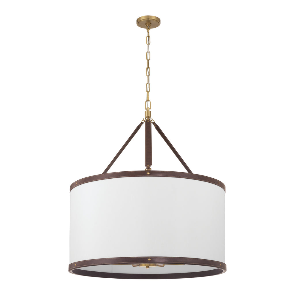 - Fabric shade with vegan leather trim.