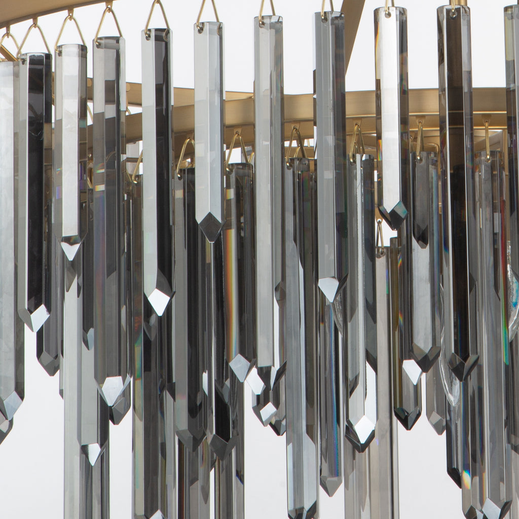 - The Gemma Collection creates dramatic radiance through its cascading prisms of silver shadow crystal. Each fixture captures and reflects light with striking dimension, offering a bold yet refined statement suited for both modern and transitional spaces.